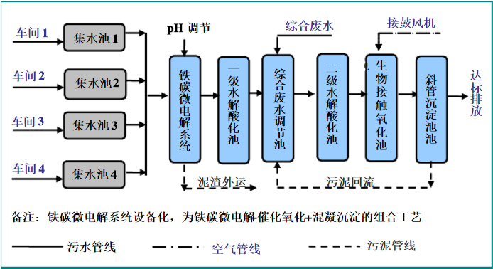 各類生產(chǎn)線的廢水進行單獨收集,之后統(tǒng)一送入初調節(jié)池中進行水質的調節(jié);預處理采用“鐵碳微電解+催化氧化+混凝沉淀”工藝,沉淀溢流到一級水解酸化池中,之后流入到綜合調節(jié)池中,與生活污水、清潔下水混合后,送入二級水解酸化池,水解后出水至生物接觸氧化池中進行好氧處理,處理后水進入沉淀池中,上清液排放。